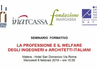 L’ Ordine degli Ingegneri della provincia di Matera, in collaborazione con l’omologo organismo degli Architetti Pianificatori Paesaggisti Conservatori dello stesso territorio, con InarCassa e Fondazione Inarcassa, ha organizzato per mercoledì ,6 fabbraio 2019 il...