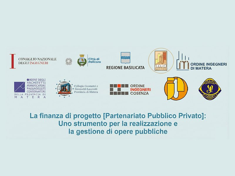 Lo scorso 20 febbraio ha avuto luogo a Policoro l’evento formativo dal titolo “La finanza di progetto [Partenariato Pubblico Privato]: uno strumento per la realizzazione e la gestione di opere pubbliche”, organizzato dagli Ordini professionali degli Ingegneri delle Province di Matera, Potenza, Taranto e Cosenza, dall’Ordine dei Dottori Commercialisti della Provincia di Matera, dall’Ordine degli Architetti Pianificatori Paesaggisti e Conservatori della Provincia di Matera, dal Collegio dei Geometri e Geometri Laureati della Provincia di Matera, dall’ANCI Basilicata, dalla Regione Basilicata, dal Consiglio Nazionale degli Ingegneri e dalla Città di Policoro.